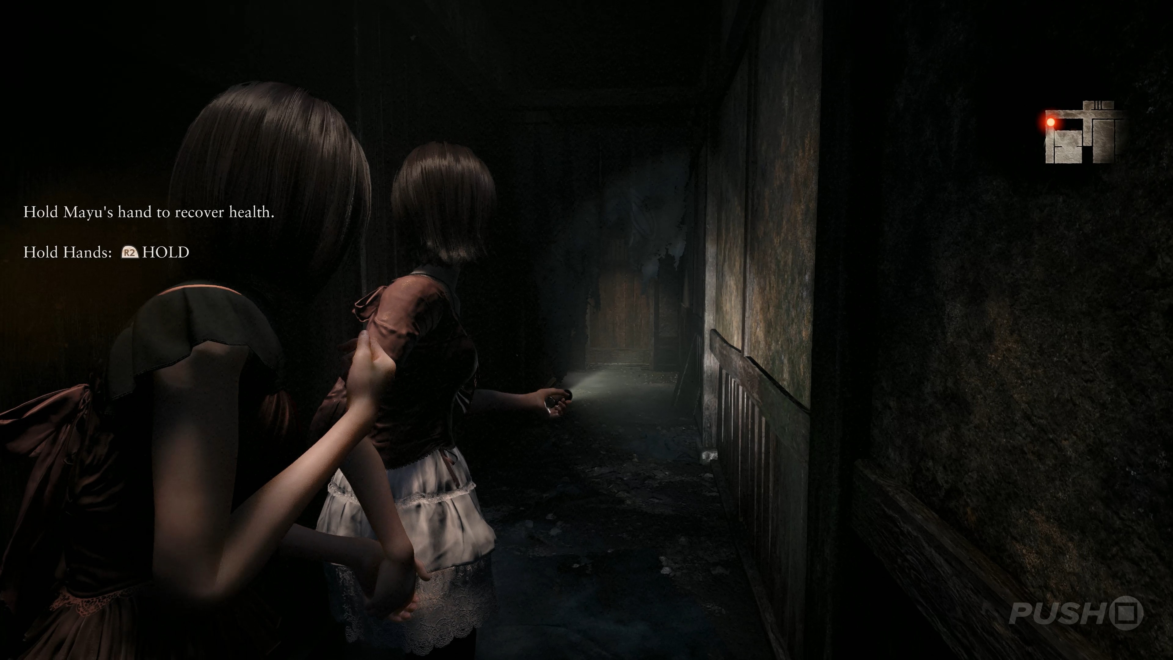 Early on, Mio and Mayu encounter their first wraith — an angry murder-ghost with a hankering for strangling twins. Thankfully, just moments earlier we were introduced to a magical ghost-killing camera, and provided with copious text-based tutorials on how to kill an angry murder-ghost. Phew.