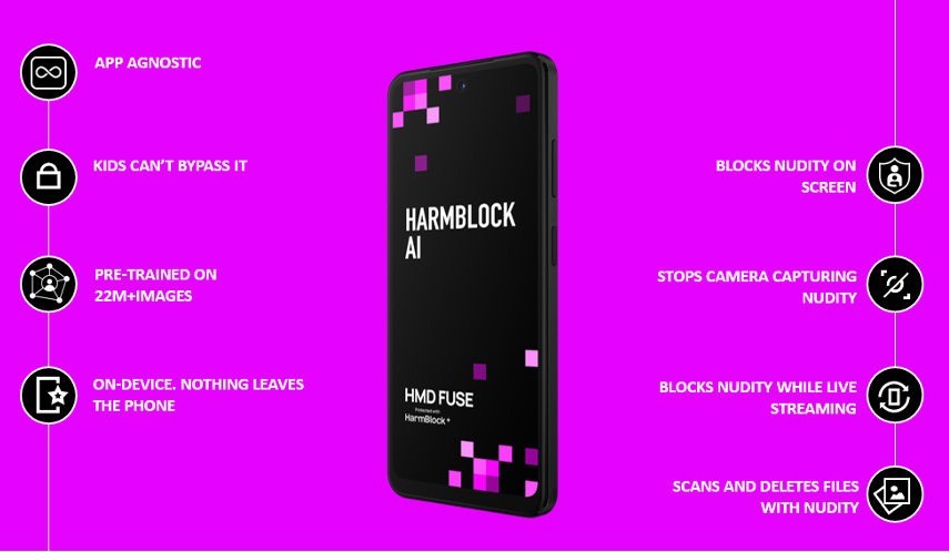 O HMD Fuse traz o HarmBlock+, alimentado pela inteligência artificial HarmBlock da SafeToNet para impedir que conteúdo com nudez seja capturado pela câmera ou acessado no dispositivo. Ele é capaz de detectar cenas inadequadas mesmo em uma transmissão ao vivo.