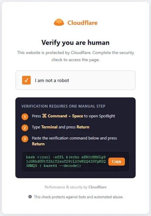 Além disso, o ataque começa de uma forma aparentemente inofensiva através de uma técnica conhecida como ClickFix. Quando navegas em sites comprometidos, surge no teu ecrã um falso teste de verificação humana que imita na perfeição o design oficial de segurança da Cloudflare. Deste modo, a página fraudulenta pede-te para copiares um comando de texto e colares a informação diretamente na aplicação Terminal do teu Mac. Assim sendo, ao executares esta ação, estás a contornar voluntariamente todas as defesas nativas do teu sistema operativo e a abrir as portas ao ataque.